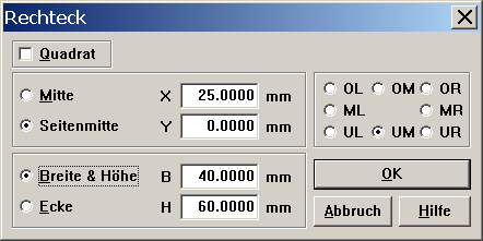 Da das Rechteck unten beginnen soll ist die Mitte in Y bei 0 mm.
