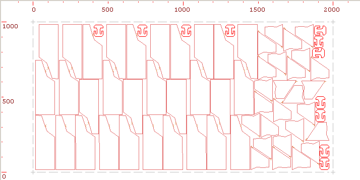 / Auftragsverwaltung über Kombination mit Zusatzprogramm. Es ist gegen Aufpreis ein Zusatzprogramm erhältlich, mit dem man die benötigten Teile auf einer Platte kombinieren / schachteln kann (Preis 1490,- Euro netto). Beispiel für eine Platte mit optimierter Teileanordnung: |