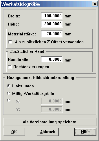können Sie ein Rechteck als Werkstückumrandung erzeugen lassen. Bei Randbreite = 0 hat das Rechteck die Abmessungen des Werkstückes. Bei Vorgabe eines Randes größer 0 wird ein entsprechend vergrößertes Rechteck erzeugt.