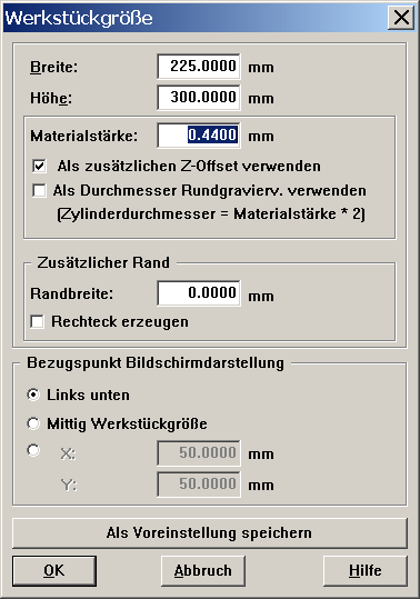 Dieser Wert ist dann im Dialog für die Werkstückgröße eingetragen, die