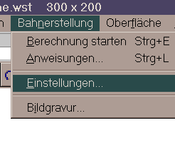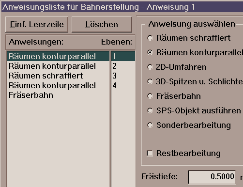 Es ist die gleiche Anweisungsliste wie im Menü "Bahnerstellung / Anweisungen" wie sie bisher für 2D-Gravuren verwendet wurde. An Hand dieser werden die Bahnen als erstes in 2D errechnet. Hier kann wieder eine Graviertiefe vorgegeben werden, die die Tiefe ab der Oberfläche vorgibt.